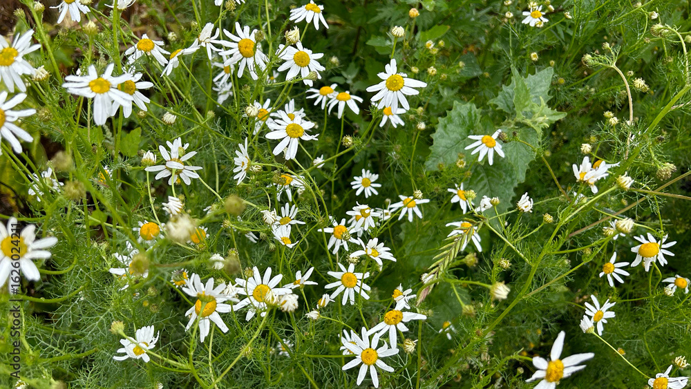 Blooming chamomile flowers with lush green leaves in a natural setting—ideal for herbal product ads, eco branding, or organic wellness content.