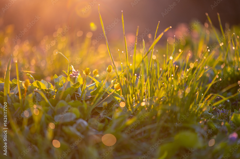 Dewy grass and tiny wildflowers in glowing golden sunrise