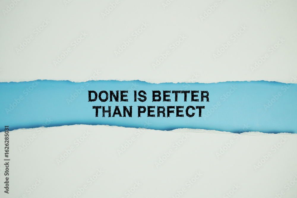 Done Is Better Than Perfect text on blue with white paper torn ripped of horizontal