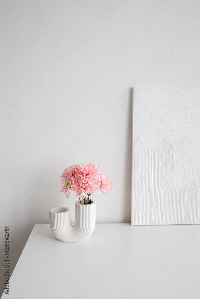Pink flowers in a geometric vase and a painting with white putty stand on chest of drawers. Trendy home decor. White stylish interior.