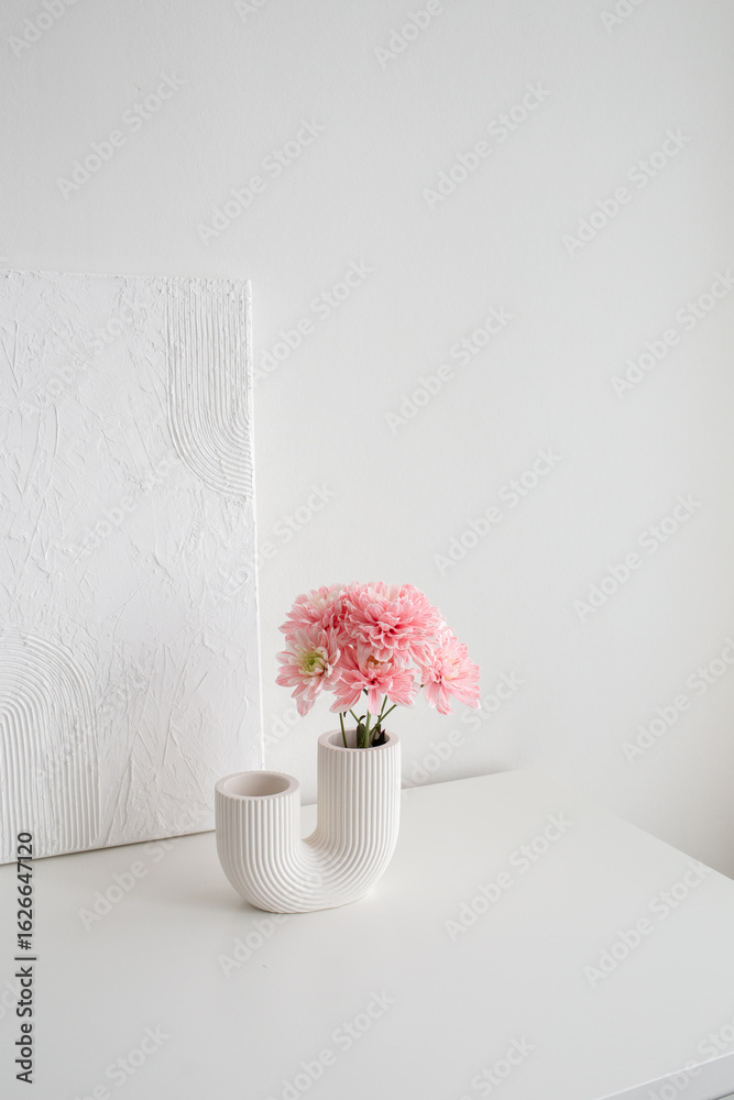 Pink flowers in a geometric vase and a painting with white putty stand on chest of drawers. Trendy home decor. White stylish interior.