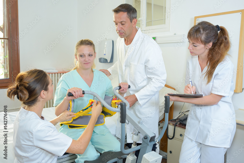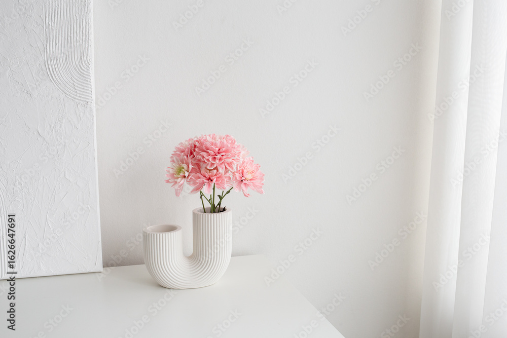 Pink flowers in a geometric vase and a painting with white putty stand on chest of drawers. Trendy home decor. White stylish interior.