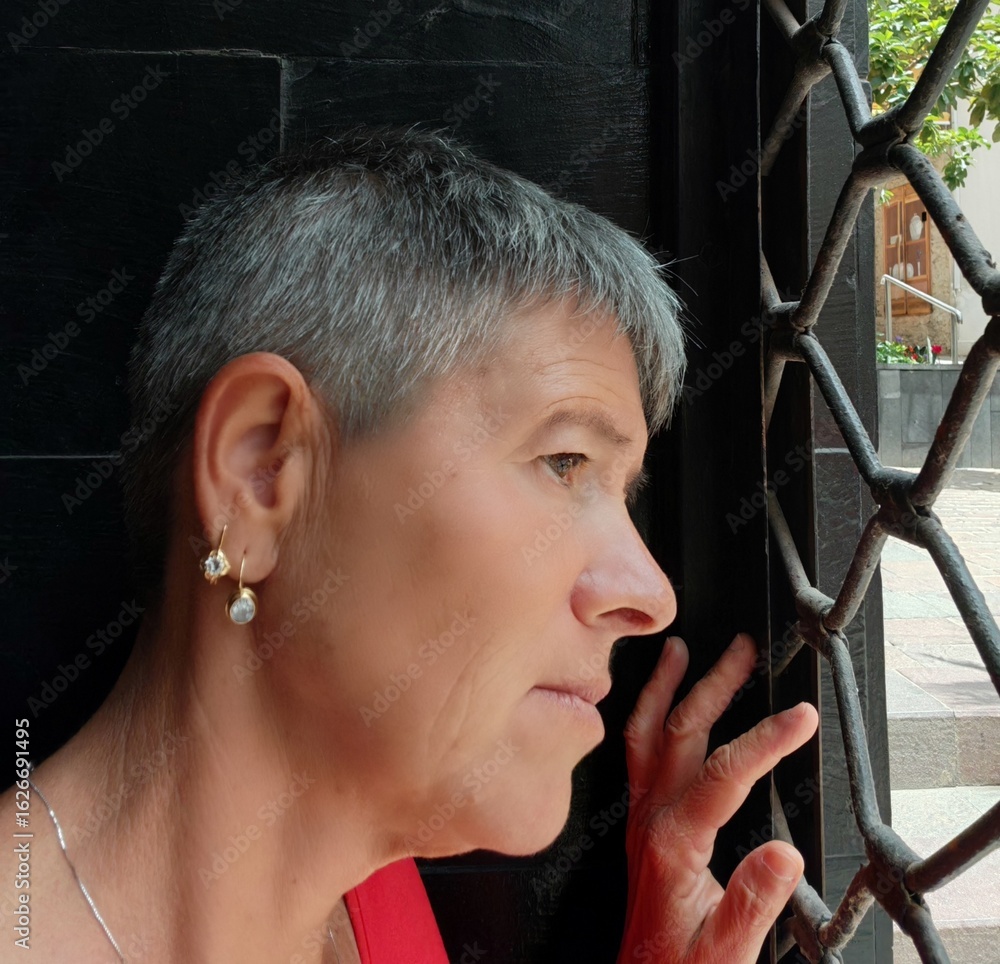 A sad woman seen in profile,behind a gate.A depressed woman feeling imprisoned. An adult girl discriminated against,imprisoned.A kidnapped woman looking out of a gate.Loneliness,imprisonment,abuse.