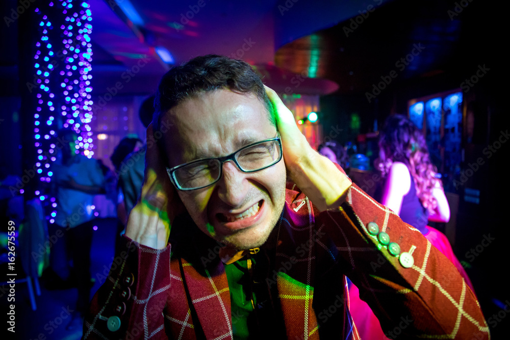 A man at a party in a suit covers his ears with hands from loud music. The man squeezed his eyes from discomfort