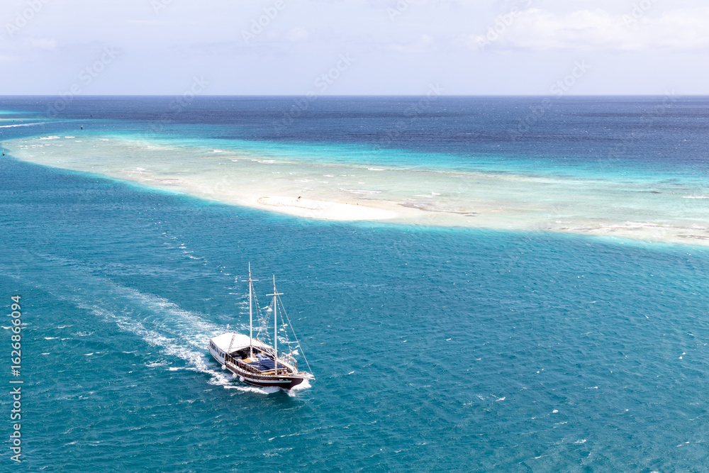 A sailboat glides past Oranjestad Key, a tiny island off the coast of Oranjestad, Aruba.