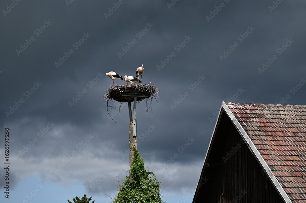 storchennest mit drei jungvögeln vor einem dunklem gewitterhimmel