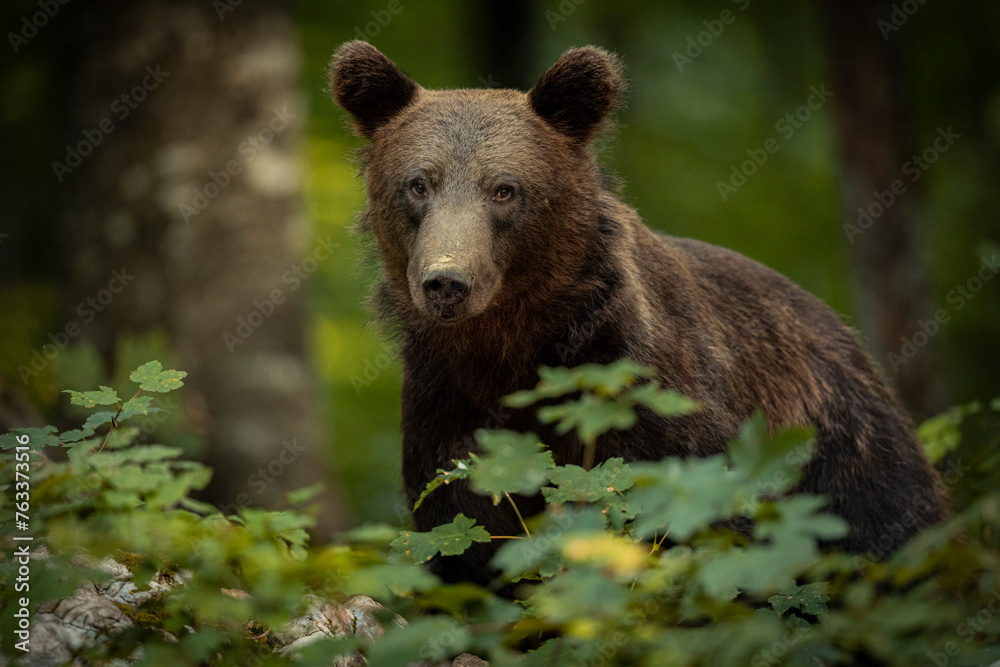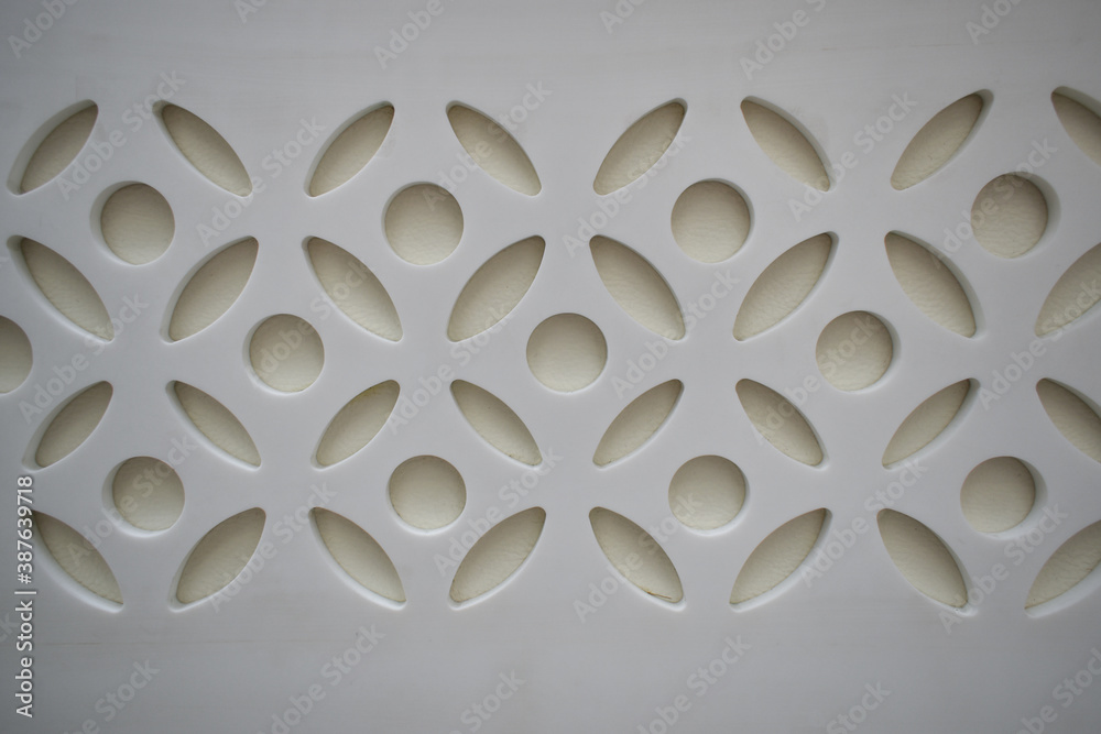 Happy Pug puppy wearing sunglasses and red santa hat holds megaphone and looking through the hole in white paper. Empty space for text