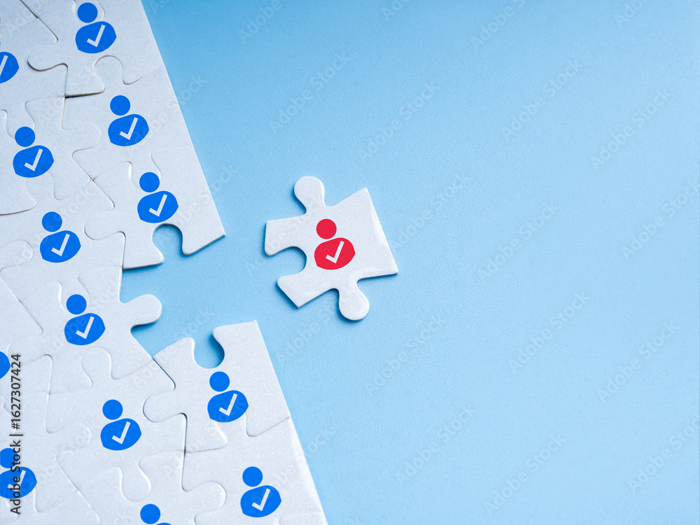 Human resources (HR), recruitment, partnership, team building, hiring concept. The red man icon as a right person on last white jigsaw puzzle piece, isolated on blue background with copy space.