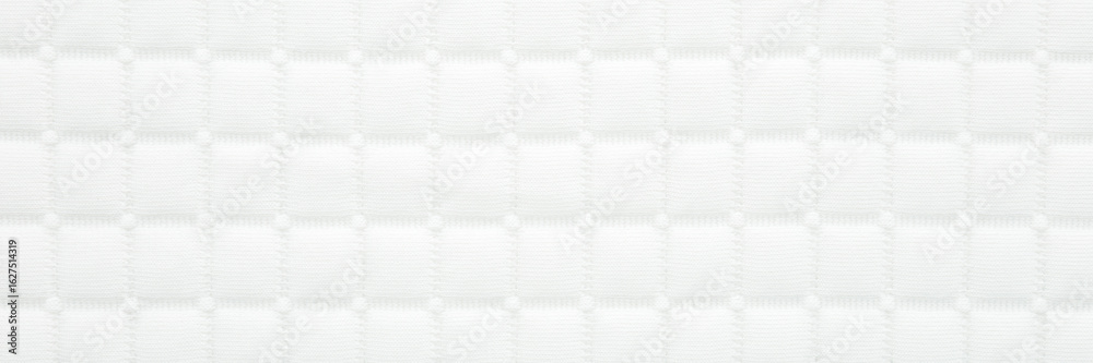 White soft cloth cover background of orthopedic mattress or pillow. Wide banner. Closeup. Empty place for text. Top down view.