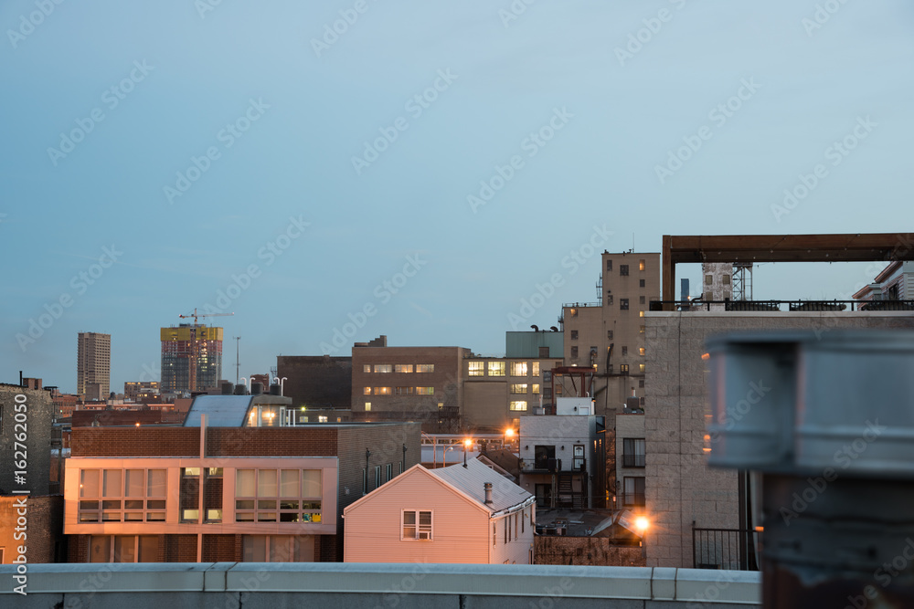 Lovely shot of city apartment buildings from a rooftop in the evening, just after sunset.