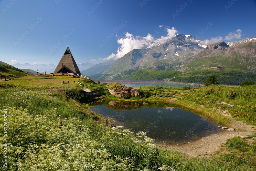 A modern pyramid shaped church on the shore of Lac du Mont Cenis (Mont Cenis lake), Savoie, Northern French Alps, France, with a moutain range and the Mount Giusalet in the background