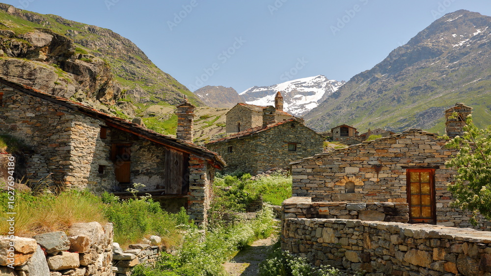 The hamlet L'Ecot, a hamlet located above Bonneval sur Arc, Vanoise National Park, Maurienne Valley, Savoie, Northern French Alps, France, with houses and traditional slate roofs