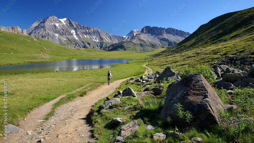 Plan du Lac, a high plateau located above Termignon in Vanoise National Park, Savoie, Northern French Alps, France, with a lake and three summits ( Grande Casse, Grande Motte and Pierre Brune)