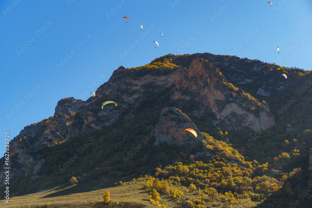 Paragliders soar gracefully against rugged mountain backdrop, with vibrant autumn foliage below and clear blue sky above. Fly Chegem paragliding site, El-Tyubu, Russia - October 7, 2024