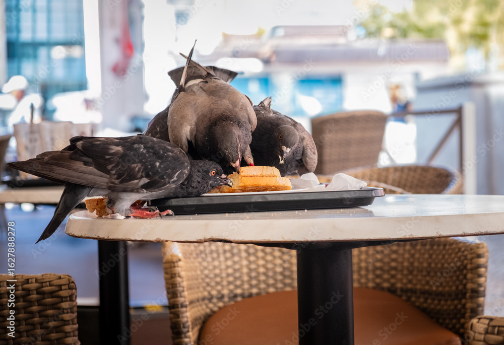 Tauben essen ein von Menschen liegen gelassenes Sandwich auf der Terrasse eines Restaurants, Lissabon, Portugal