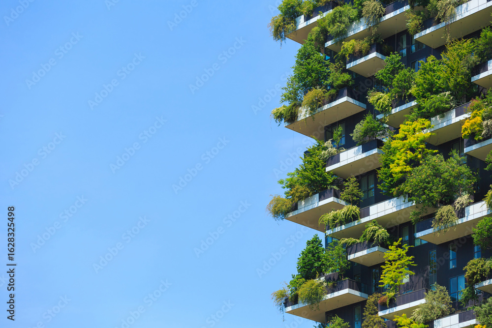 Vibrant vertical garden on energy efficient building, featuring lush greenery on balconies throughout the facade against a clear blue sky.