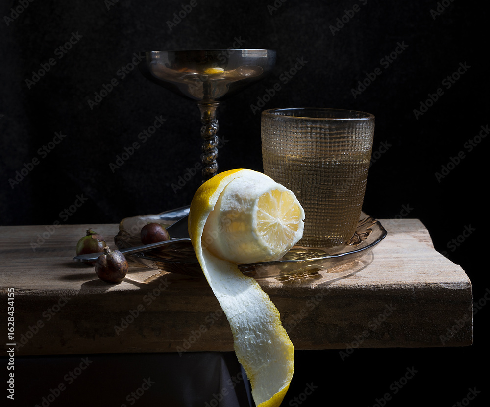 Baroque still life, lemon with its peel hanging on a wooden board II