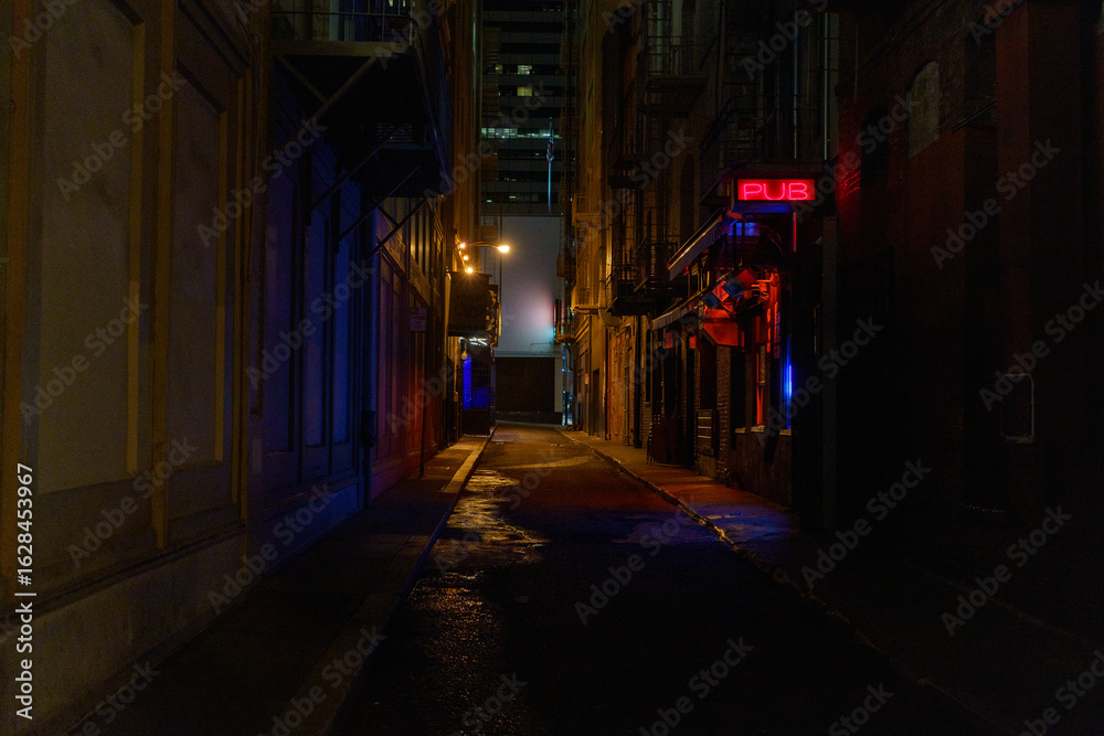 A bright red neon pub sign illuminates a dark, wet city alley, casting colorful reflections onto the pavement.