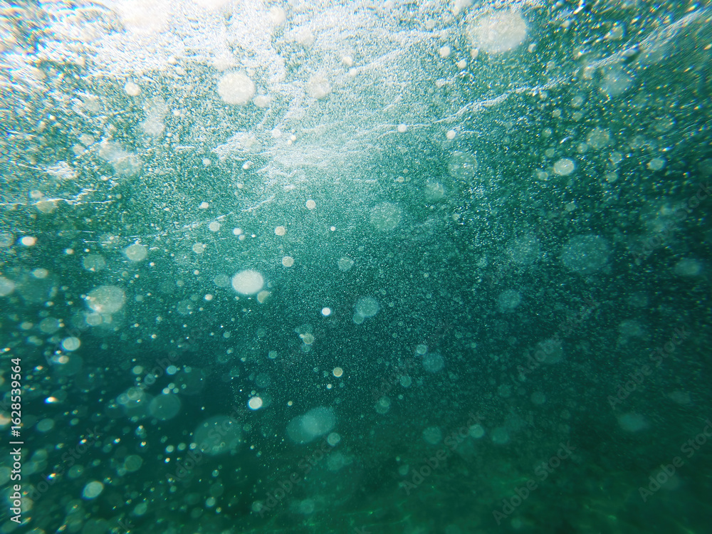 Underwater view with air bubbles and sunlight filtering through the sea in Halkidiki, Greece.