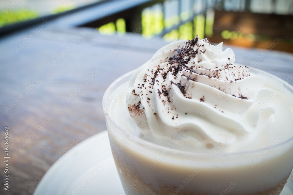 Delicious milk pudding with grated chocolate over napkin on wood table