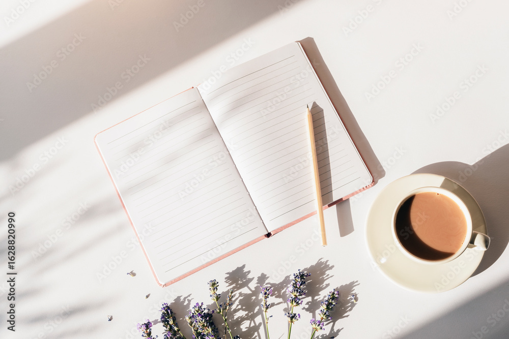 Blank notepad, coffee cup and lavender flowers on white table with shadows. Top view, flat lay, mockup