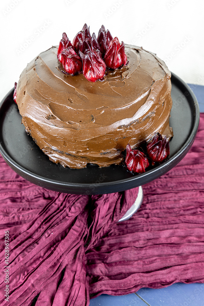 Dark chocolate fudge cake with candied roselle hibiscus calyxes on top