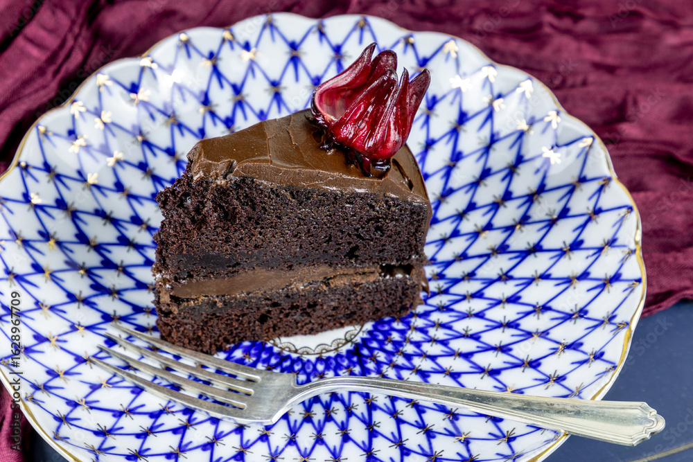 Dark chocolate fudge cake with candied roselle hibiscus calyxes on top