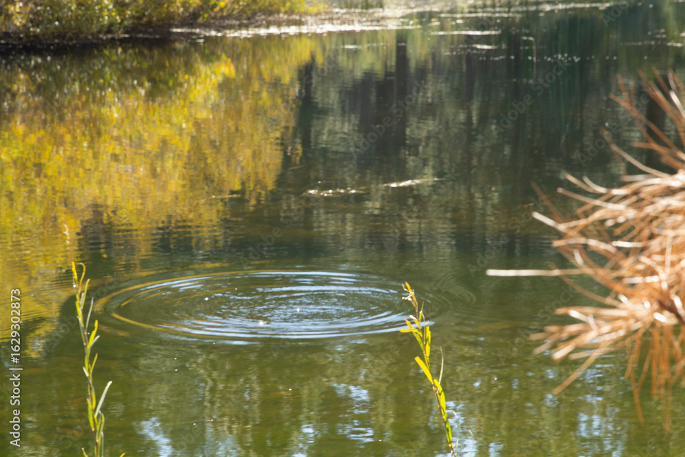 Trout Rise Form Ring in Calm Water with the Reflection of Yellow Leaves and Green Trees