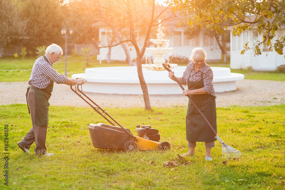 Couple of elderly gardeners working. Lawn mower and rake. How to keep garden clean.