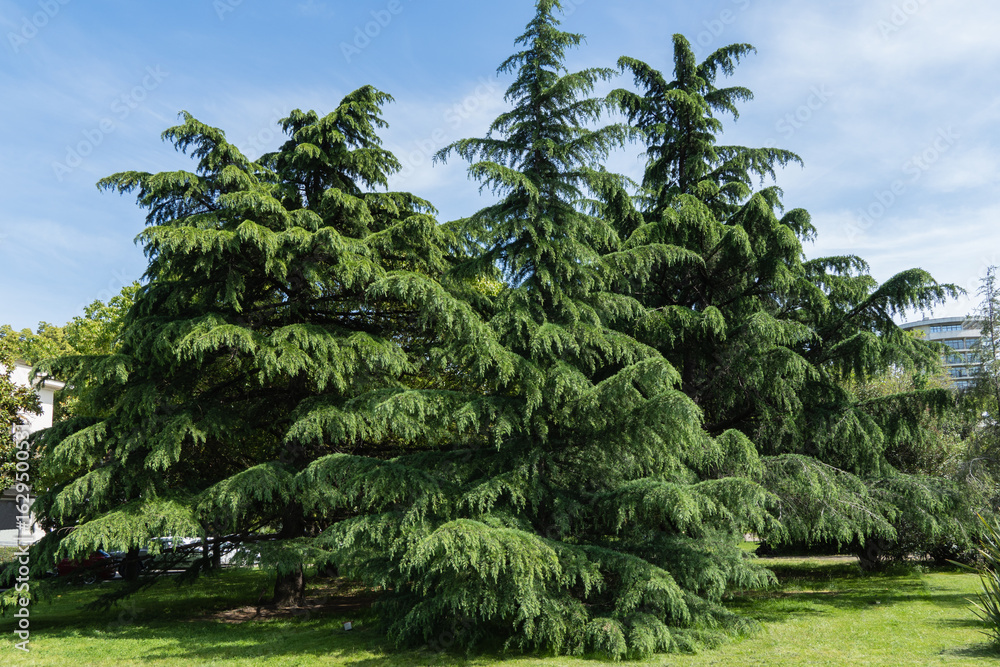 Lush, expansive Himalayan Cedar, Cedrus Deodara (Deodar Cedar, Himalayan Cedar) with dense green foliage, standing prominently in well-maintained grassy area under clear blue sky.