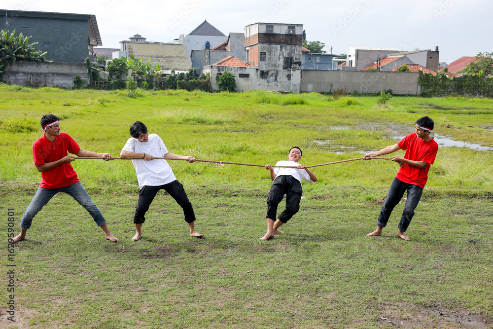 Young Indonesian Friends Celebrate Independence Day with a Game of Tug of War