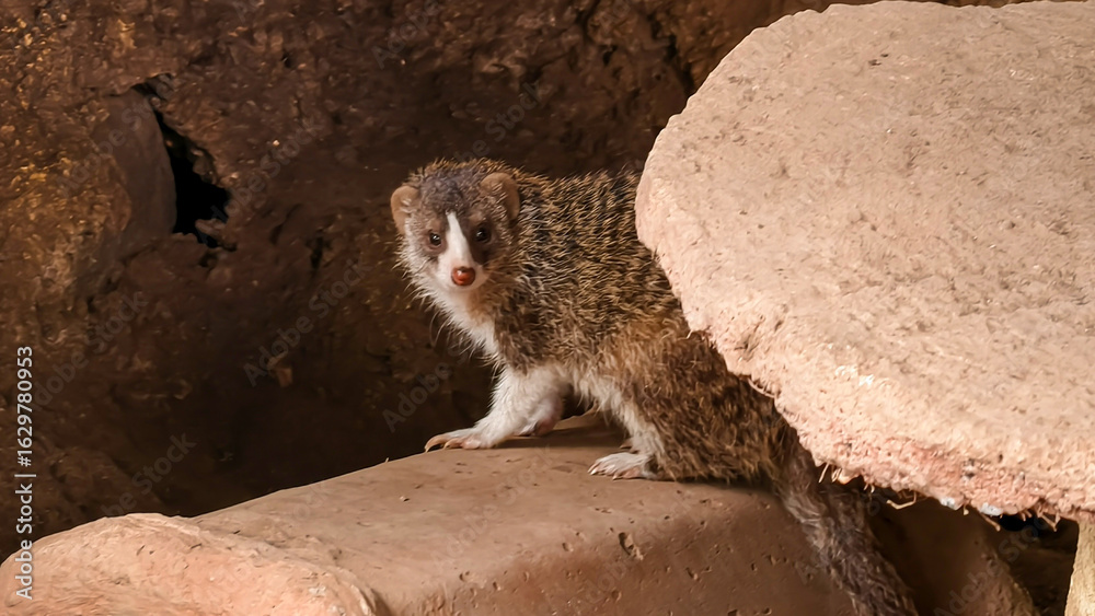 A young meerkat peeks out from behind earthy rocks, its curious gaze fixed on the viewer.