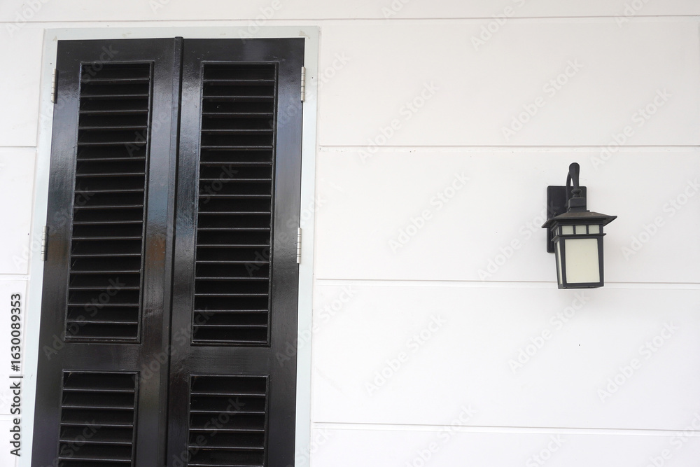Modern black shutters and classic wall lantern create elegant exterior architectural detail