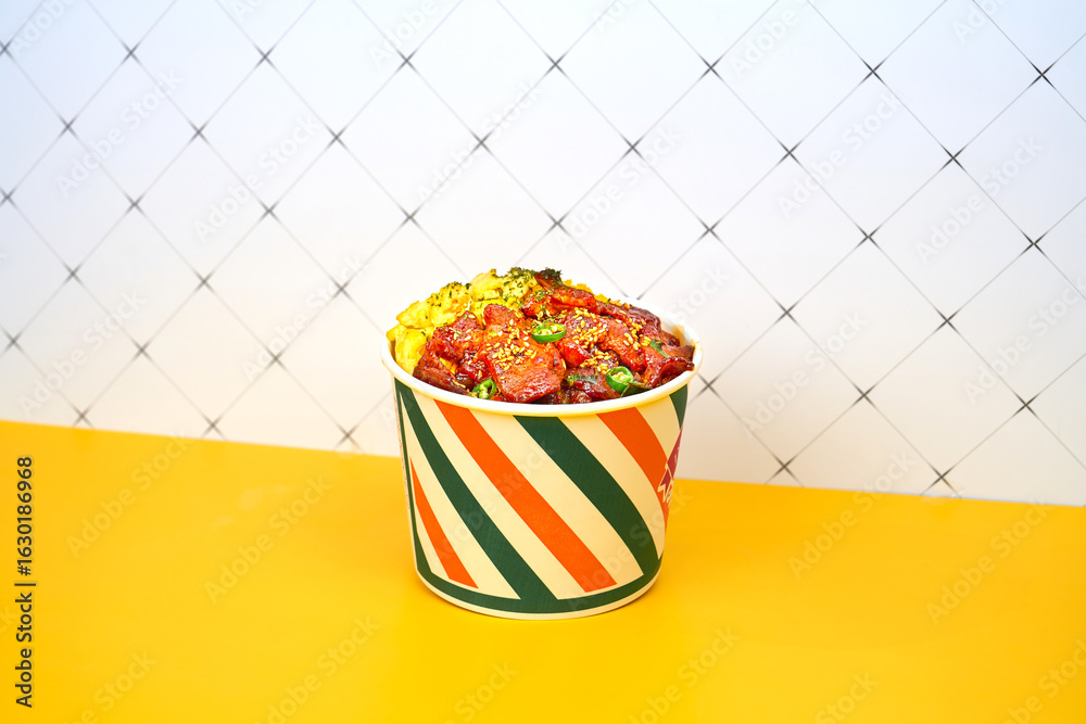 김치삼겹덮밥이 컵에 담겨 있는, 컵밥의 모습
