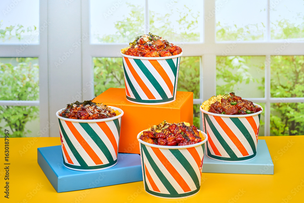 컵밥 여러개를 컨셉에 맞게 놓여진 모습