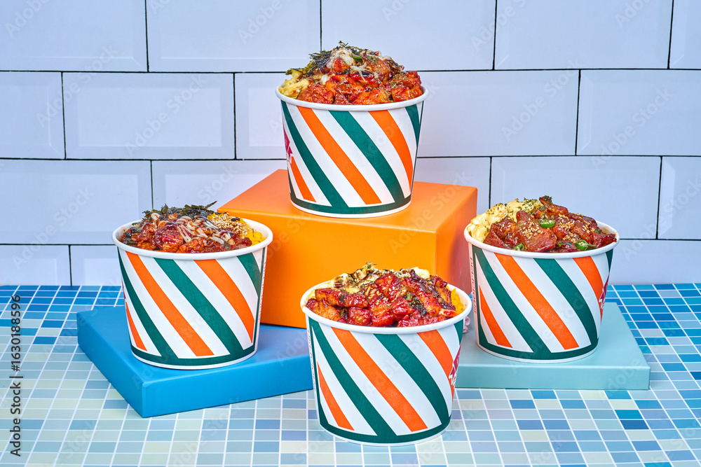 컵밥 여러개를 컨셉에 맞게 놓여진 모습