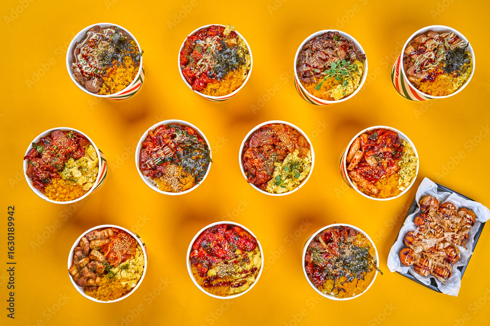 컵밥 여러개를 컨셉에 맞게 놓여진 모습