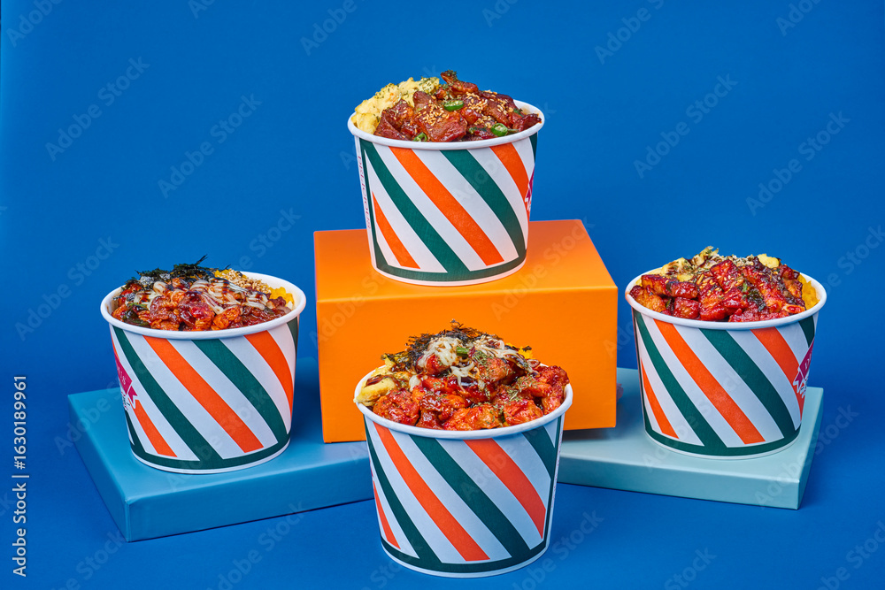 컵밥 여러개를 컨셉에 맞게 놓여진 모습
