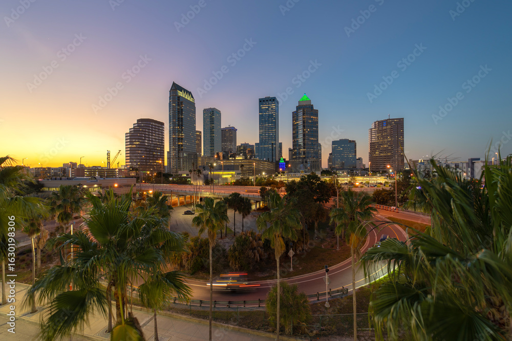 Night urban landscape of downtown district of Tampa in Florida, USA. American city skyline with brightly illuminated high commercial buildings and high speed highway road