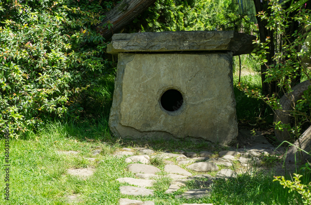 Dolmen built in our time in the Riviera Park of Sochi. The rough-hewn stones and verdant surroundings evoke sense of tranquility and timelessness