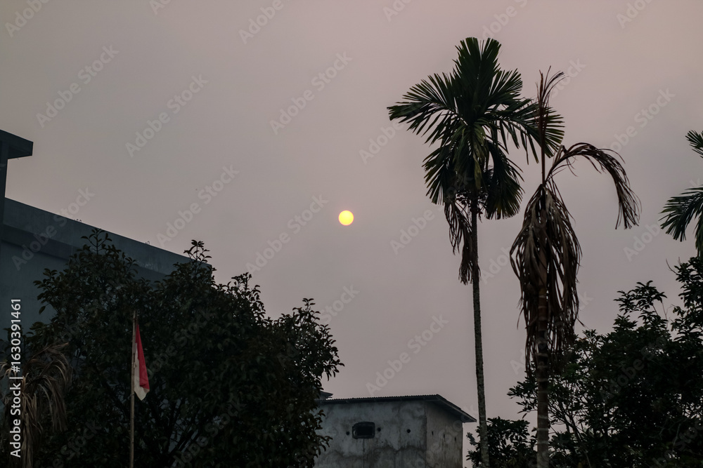 Thick haze from forest fires dims the sunlight, casting a muted glow behind tree silhouettes, as smoke-filled air obscures visibility and creates an eerie, suffocating atmosphere.