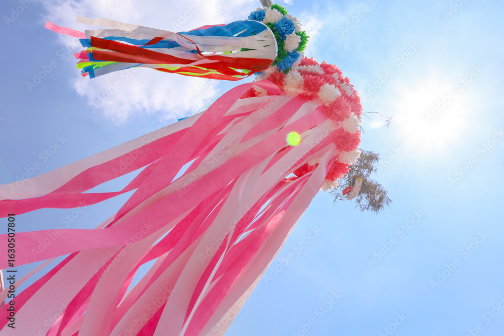 夏の青空と太陽、風に揺れる吹き流し
