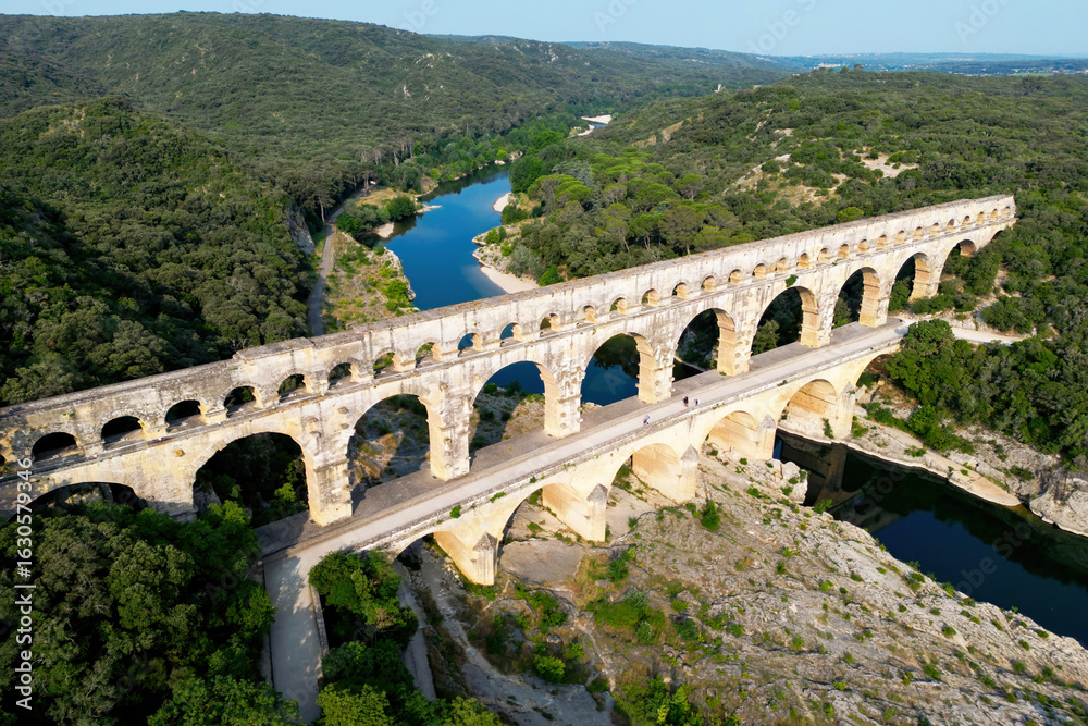 Pont du Gard, ancient Roman aqueduct bridge built in the first century AD crossing river Gardon in southern France, a world heritage site
