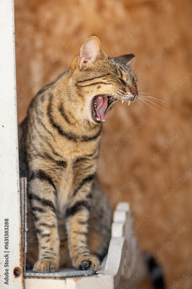 striped gray cat in shelter close up photo. High quality photo