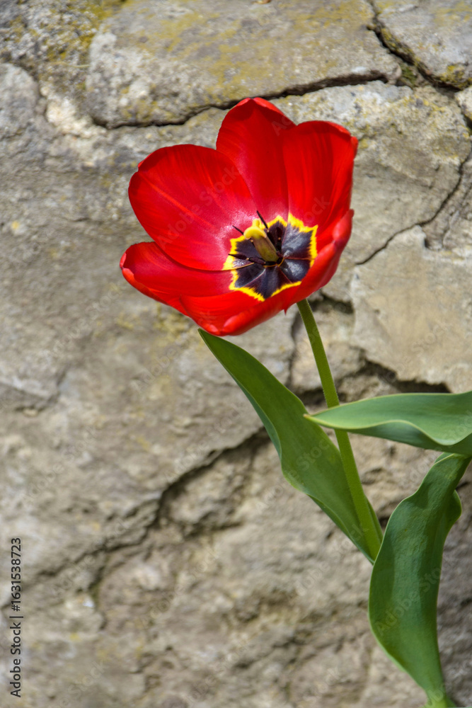 Blooming red tulip on background of gray old wall. Close-up. Soft focus.