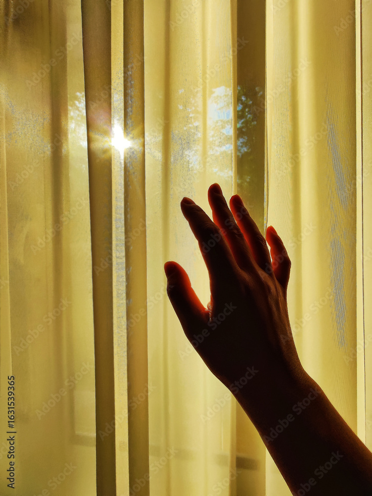 Silhouette of woman's hand on background of window with tulle curtain at sunset. Woman's hand touches transparent yellow curtain. Close-up. Copy space.