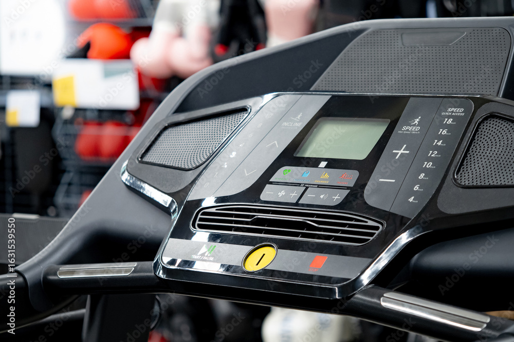 Modern treadmill console with digital display monitor screen. Sport equipment for indoor running training in sport shop