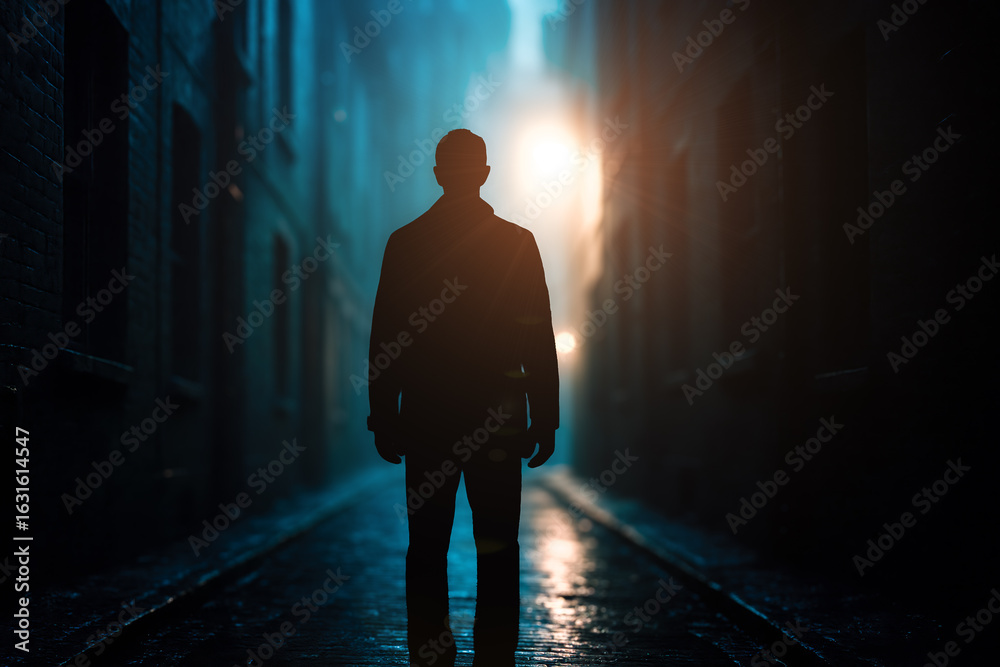 Mysterious person silhouette standing in dark urban alley at night with blue backlight, concept of fear, crime, urban danger, safety, threat