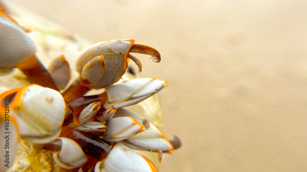 A colony of barnacles with open tentacles on the surface. A close-up of the crustacean Lepas anatifera with tentacles.