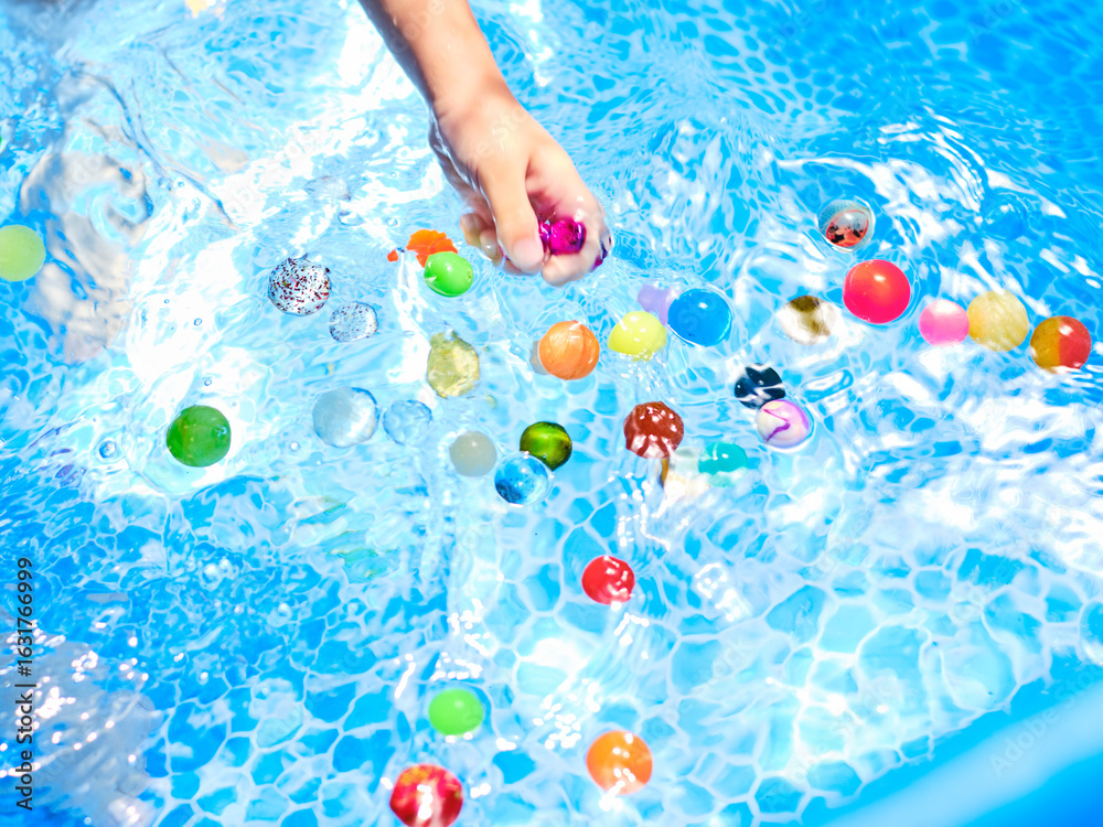 カラフルなボールを浮かべたプールでの水遊びをするこどもの手
